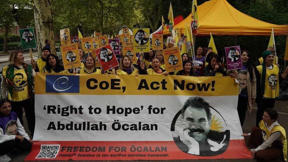 Strasbourg’da Avrupa Konseyi önünde toplanan Kürtler, Abdullah Öcalan için “Umut Hakkı” yasasının kabul edilmesini talep etti. Fransa’nın Strasbourg kentinde bulunan